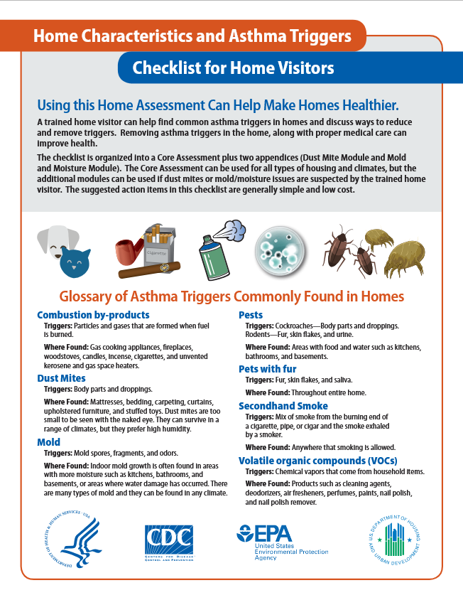 EPA developed the Home Environment Checklist to help home care visitors by providing a list of questions and action steps to assist in the identification and mitigation of environmental asthma triggers commonly found in and around homes. The checklist is designed to allow home care visitors to focus on the specific activities or things in a room - in particular the asthma patient’s sleeping area - that might produce or harbor environmental triggers. The activities recommended in the checklist are generally simple and low cost.